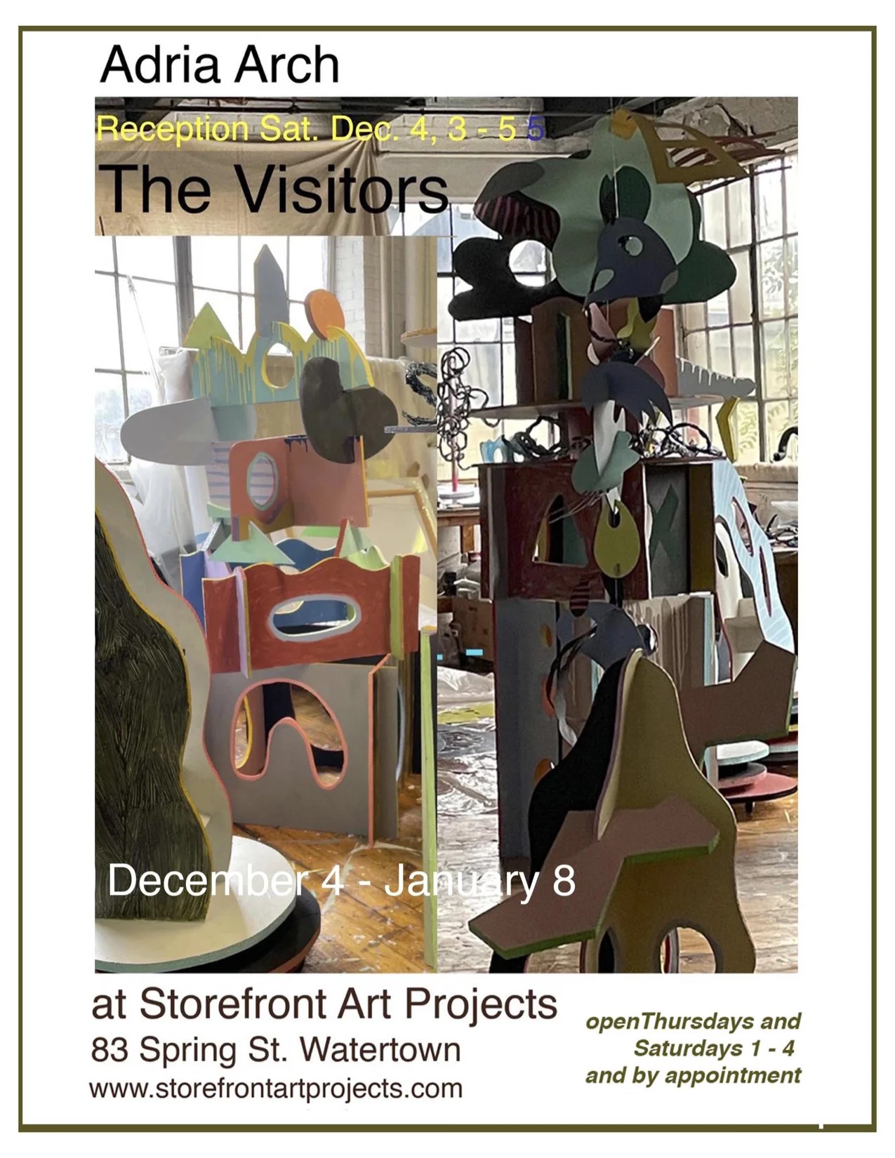 Human-scaled, totem-like sculptures with crown-like constructions on top recall children's toys with colors that run the gamut from grape and rose to plum and avocado. Since 2019, Adria’s hanging kinetic shapes have been shown at the Danforth, Brattleboro, Fitchburg, Bristol and Cahoon Museums. She keeps pushing and combining the limits of mobile, stable, sculpture and painting. These are her newest pieces, all completed during the Pandemic.